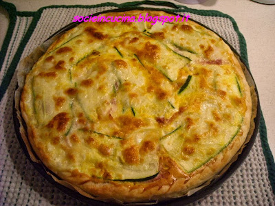 Sulla pasta sfoglia fare il primo strato con le fette delle zucchine e un pizzico di sale, aggiungere sopra le fette di prosciutto cotto e terminare con le fette di mozzarella.